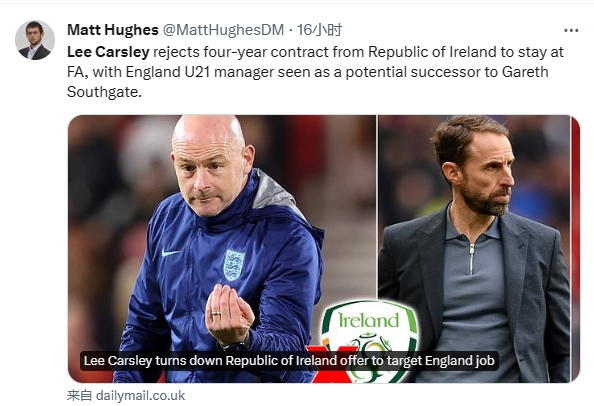 邮报:英格兰U21主帅卡斯利拒绝执教爱尔兰,想竞争英格兰帅位